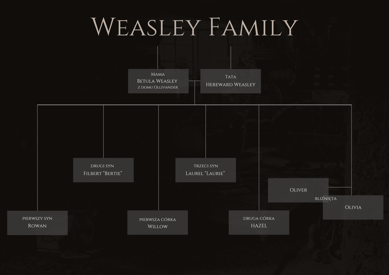 Poza tym, że rodzeństwo jest rude i piegowate z krwi i kości, to mama pochodzi z rodu Ollivanderów, przez co każde z dzieci otrzymało imię związane z nazwą drzewa. Drugie imię było natomiast kaprysem ojca i zawsze pochodzi ono z legend arturiańskich. (Imion rodzeństwa nigdy nie użyłam na fabule, więc można tu coś pozmieniać.)